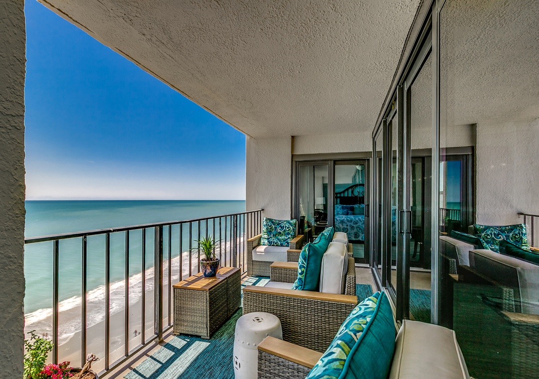 - Balcony seating for 9–11, including dining table, club chairs, and stools