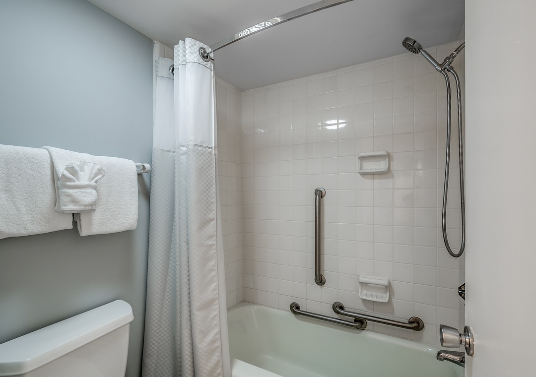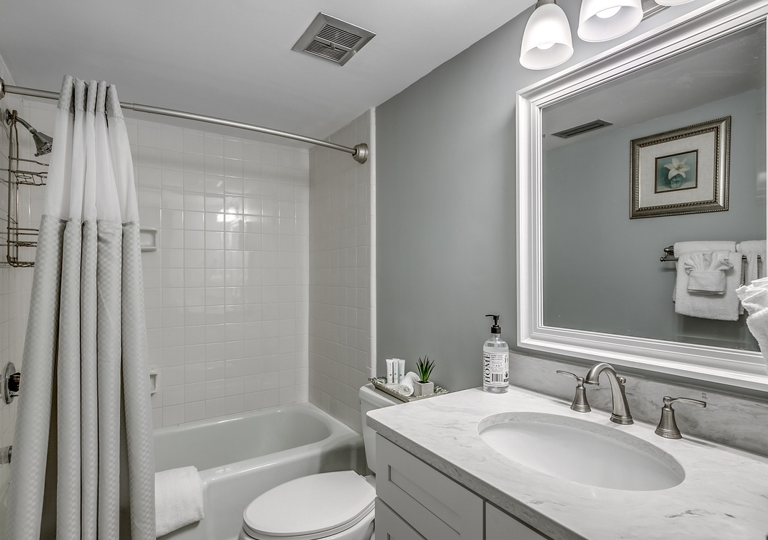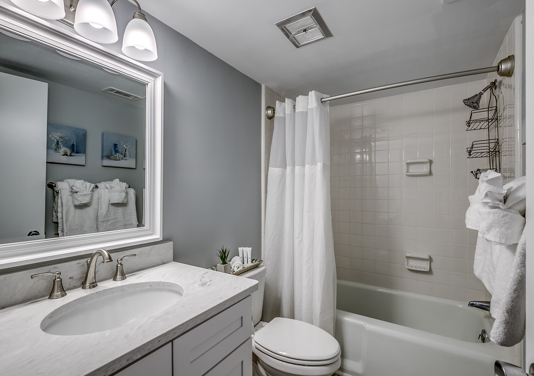 - Total: 4 full bathrooms; curved rods and hookless shower curtains