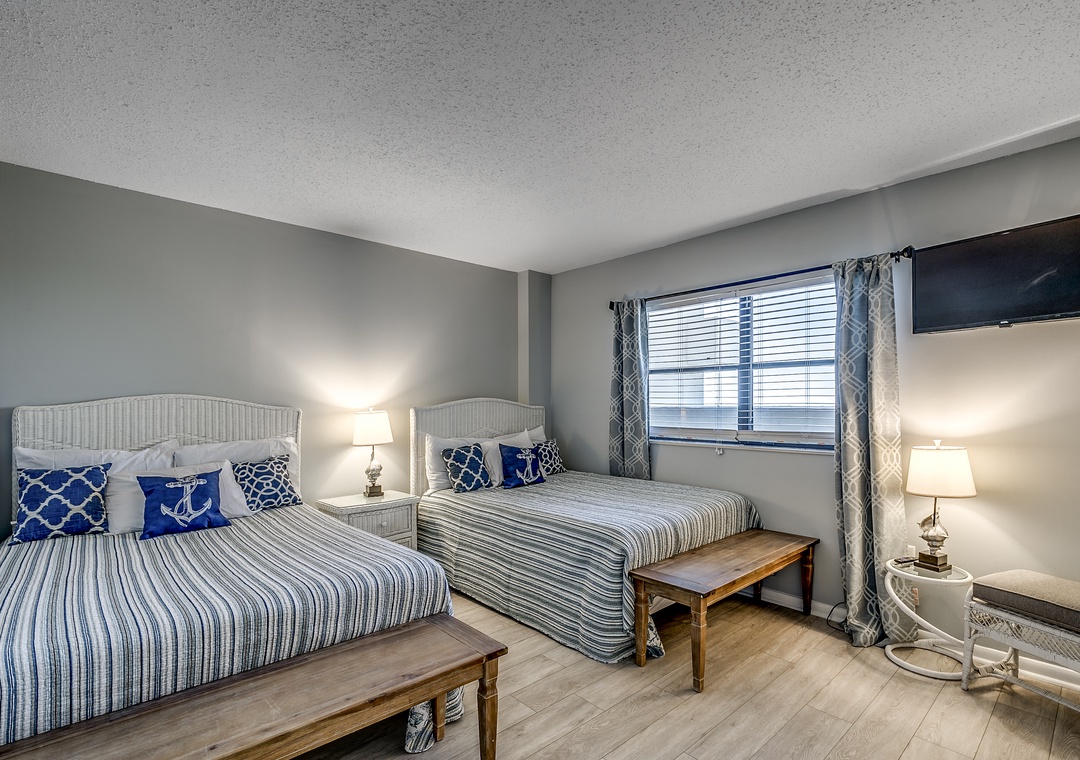 This large oceanfront condo offers 30 feet of direct beachfront views from a private 12th-floor balcony. The spacious layout includes two master suites with king beds and balcony access, plus two additional bedrooms for flexible sleeping. A full kitchen, a large living area with a 65" TV, and four full baths provide comfort and convenience for families and groups.