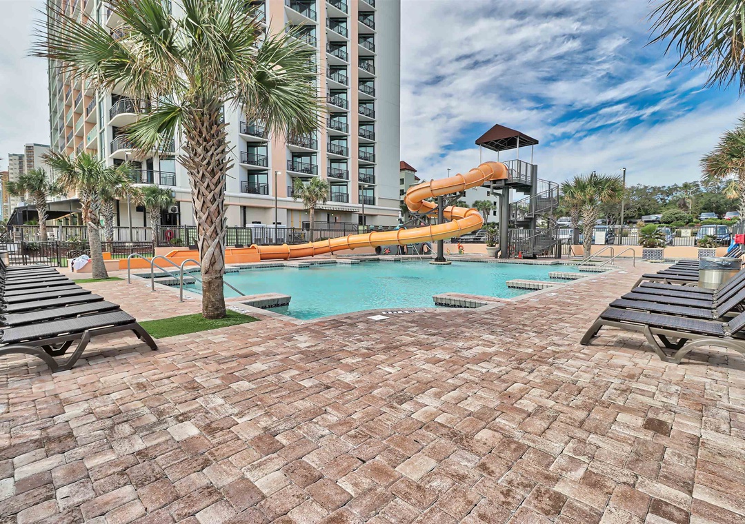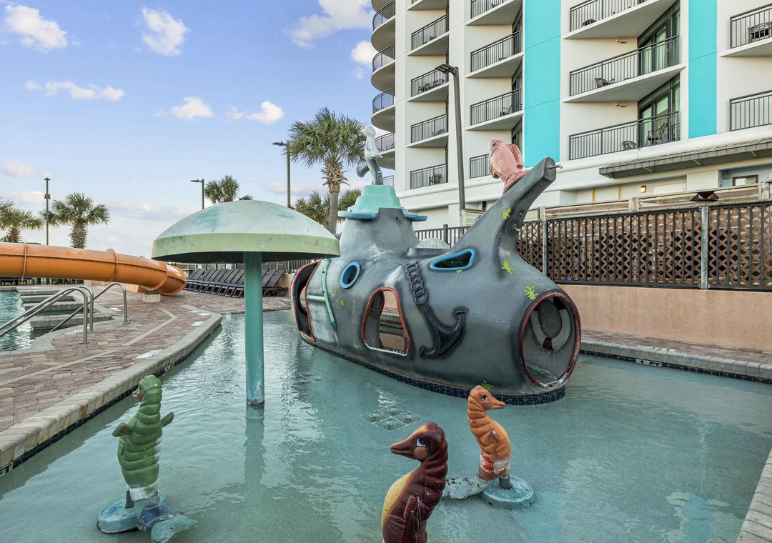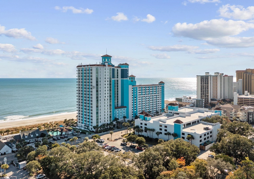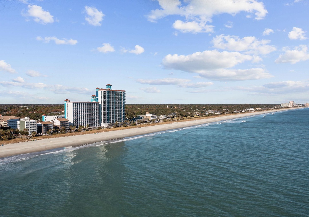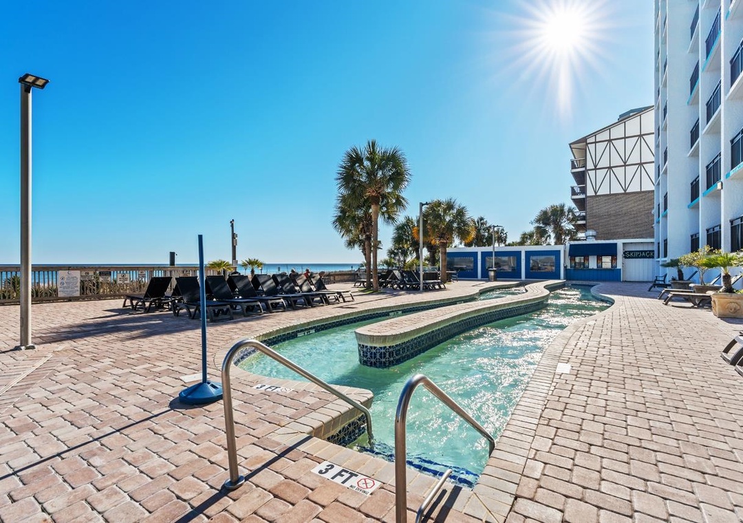 The resort is located in the heart of the Grand Strand in a quiet family oriented section of the beach. Activities on site include the indoor and outdoor pool complex which includes a lazy river, 2 pools, 4 hot tubs and children’s splash pool all overlooking the beach along with a fitness center and tanning lawn. The resort also has a Starbucks and ice cream shop onsite.