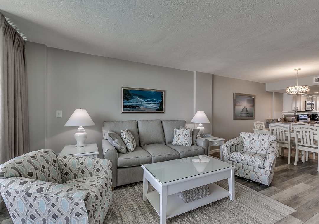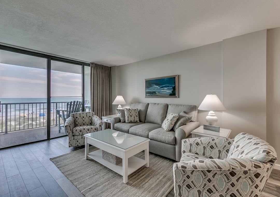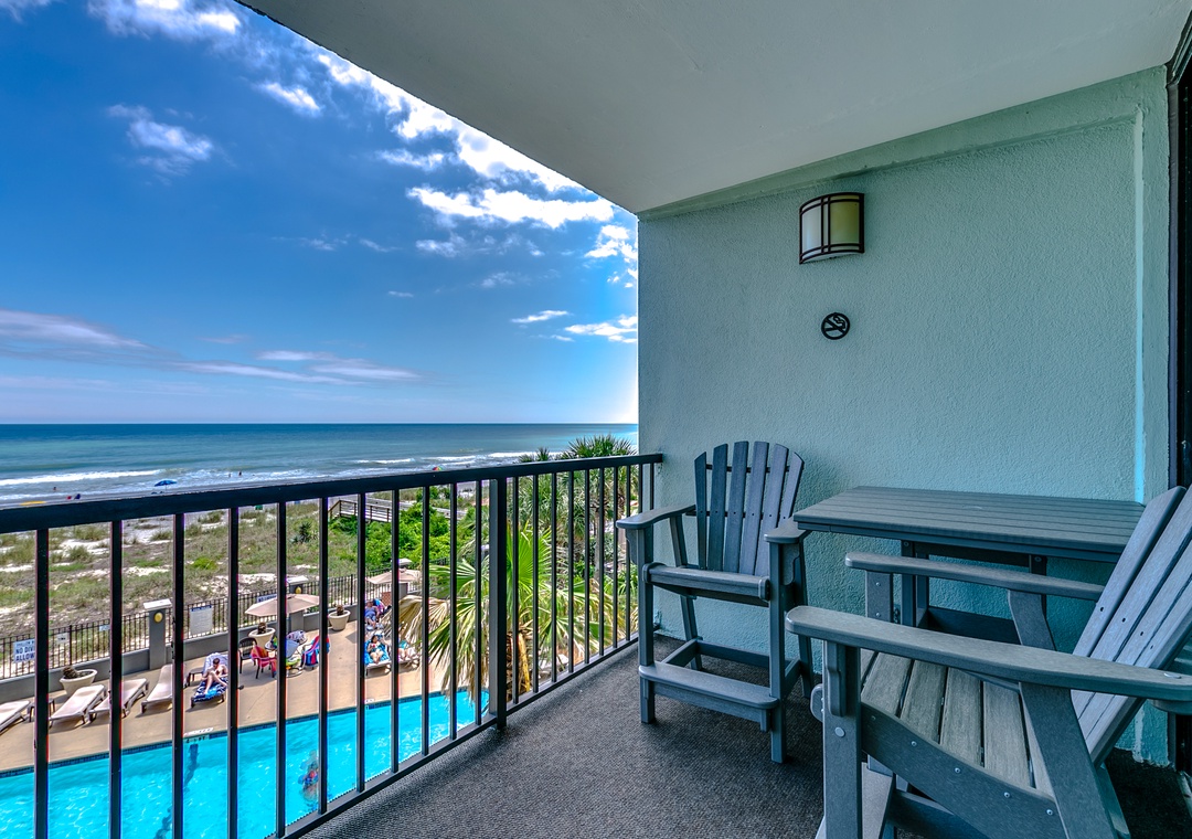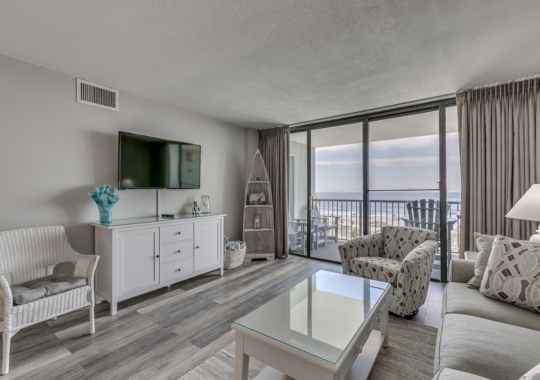 Located in the Carolina Dunes. Enjoy beautiful views of the ocean from the oversized balcony of this updated 2 bedroom 2 bathroom condo! You will feel right at home with its large open kitchen w granite countertops and stainless appliances, flat screen TVs, washer and dryer, spacious living room and a private balcony giving plenty of room for you and your guests to enjoy your Myrtle Beach vacation. This two bedroom condo has a king bed in the master along with full bath, second bedroom offers two queens, and the living room provides a queen size sleeper sofa.