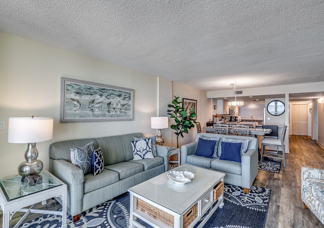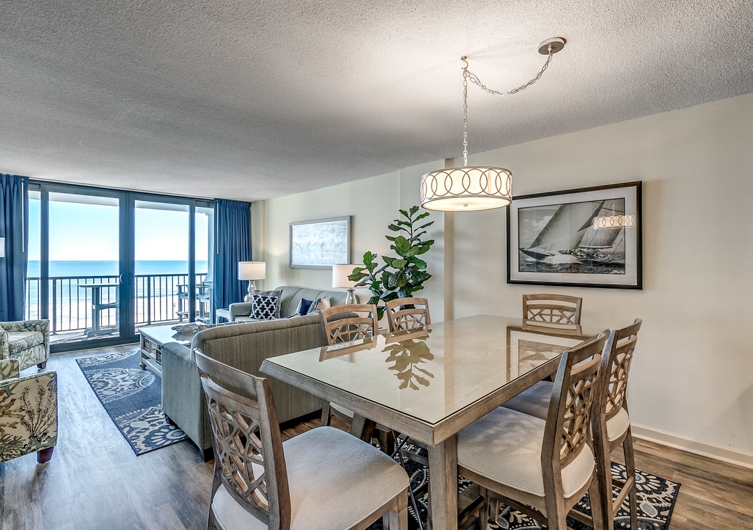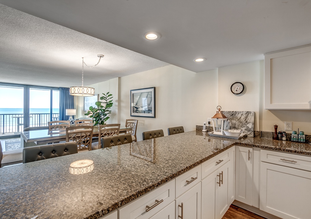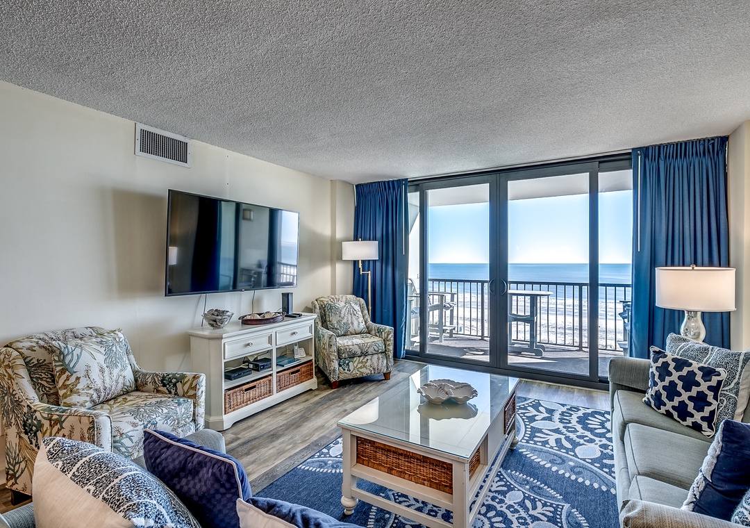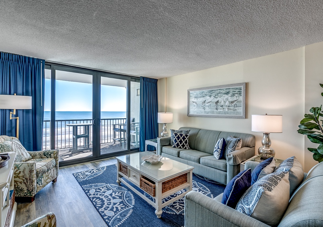 Enjoy your first cup of coffee or afternoon cocktails on your private oceanfront balcony in this updated 3-bedroom, 2-bathroom condo! Located at Carolina Dunes, this recently renovated condo features all new stainless-steel appliances and new furniture in the living room and dining room area to include 4 new bar stools. The kitchen has been updated with new kitchen cabinets, granite countertops, and recess can lighting. Additionally, the condo features a new sliding glass door and all new balcony furniture to enjoy the beautiful ocean views. Inside, new furniture includes a complete Master Bedroom Suite along with new lamps/light fixtures and artwork throughout the condo. You will feel right at home with its large open, well-equipped kitchen, a 65” smart flat screen TV in the living room, washer and dryer, and spacious living room giving plenty of room for you and your guests to enjoy your Myrtle Beach vacation. Master bedroom has a king bed, 55” Smart TV with a full bath, the second bedroom offers two twin beds, third bedroom with two full beds and the living room has a queen size sleeper sofa.