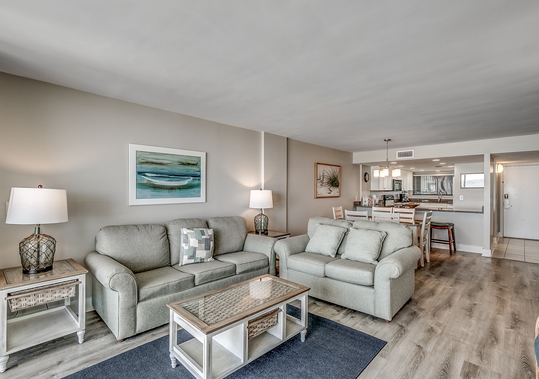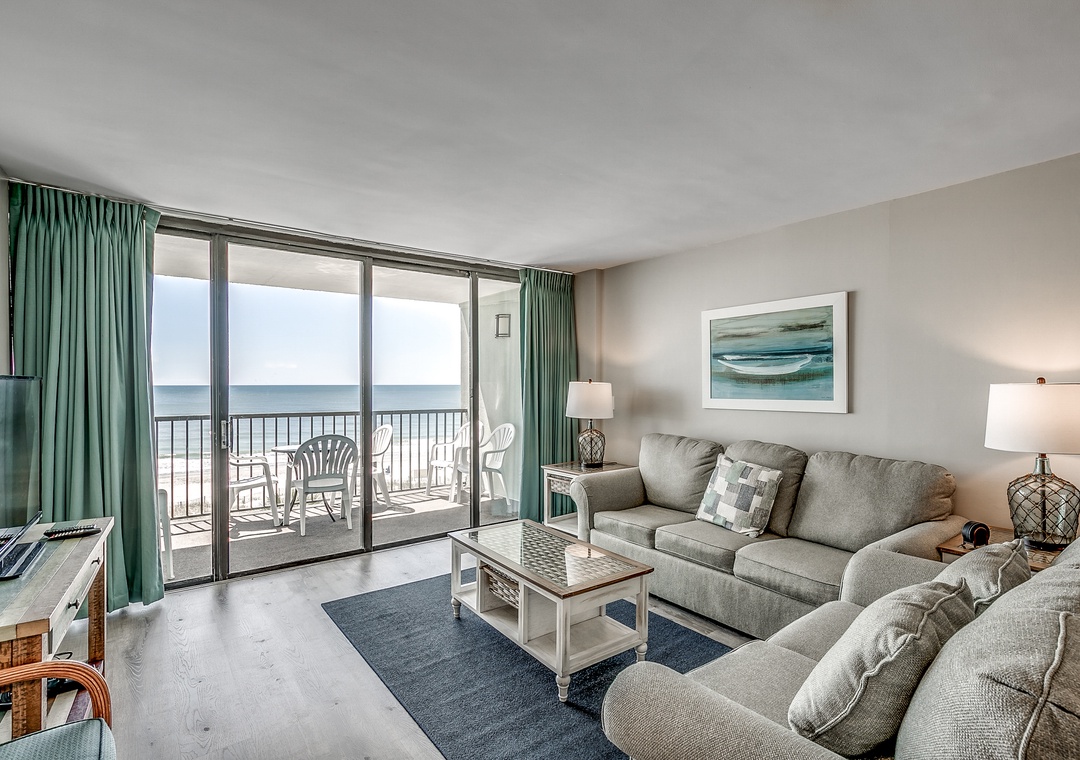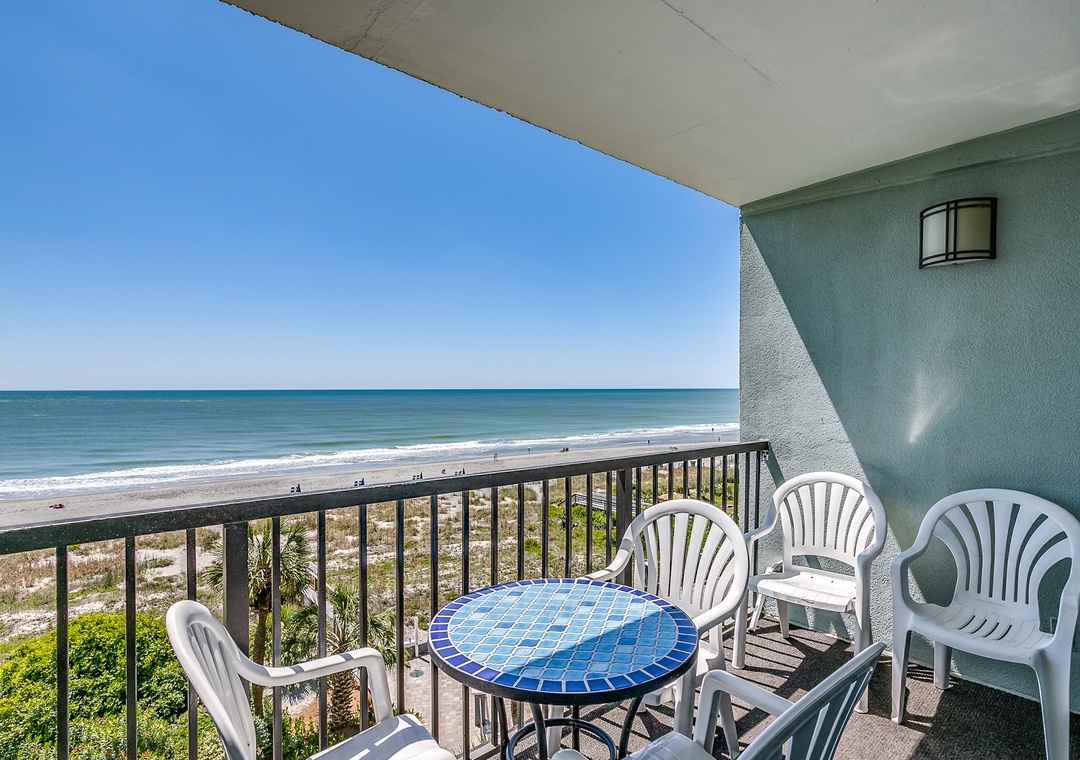 Located in the Carolina Dunes. Enjoy beautiful views of the ocean from the oversized balcony of this updated 2 bedroom 2 bathroom condo! You will feel right at home with granite countertops in its large open kitchen, flat screen TVs, full sized washer and dryer, spacious living room and a private balcony giving plenty of room for you and your guests to enjoy your Myrtle Beach vacation. This two bedroom condo has a king bed in the master along with full bath, second bedroom offers two queens, and the living room provides a sleeper sofa.