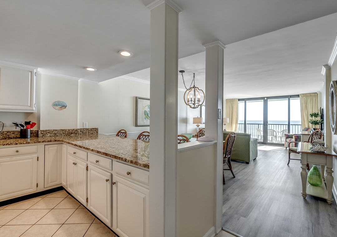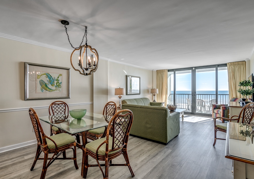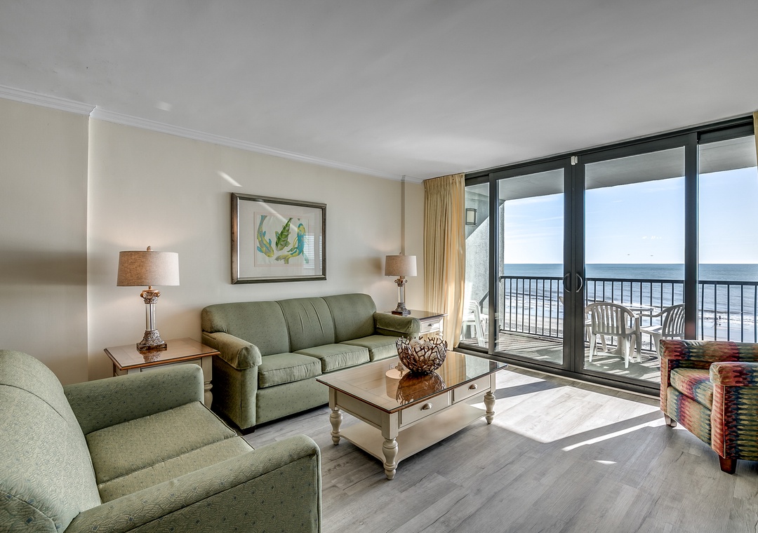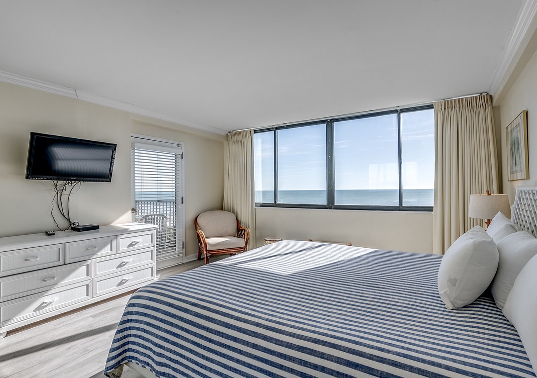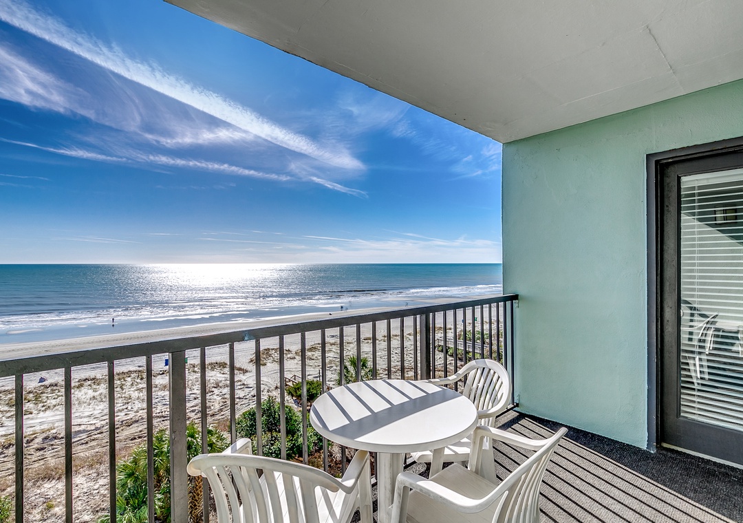 Located in the Carolina Dunes. Beautiful views of the ocean from the oversized balcony of this updated 2 bedroom 2 bathroom condo makes it a perfect stay! You will feel right at home with its large open kitchen, flat screen TVs, full sized washer and dryer, spacious living room and a private balcony giving plenty of room for you and your guests to enjoy your Myrtle Beach vacation. This two bedroom condo has a king bed in the master along with a full bath, the second bedroom offering two queen beds, and the living room providing a sleeper sofa.