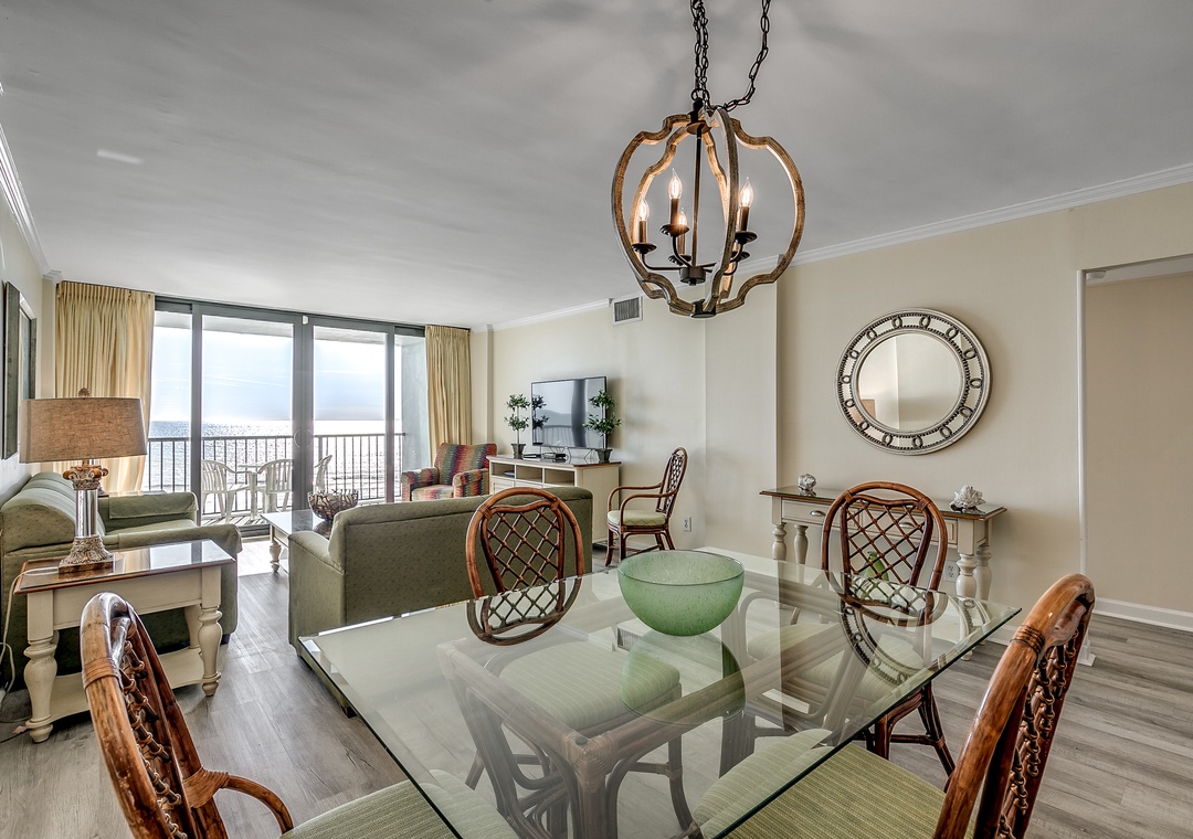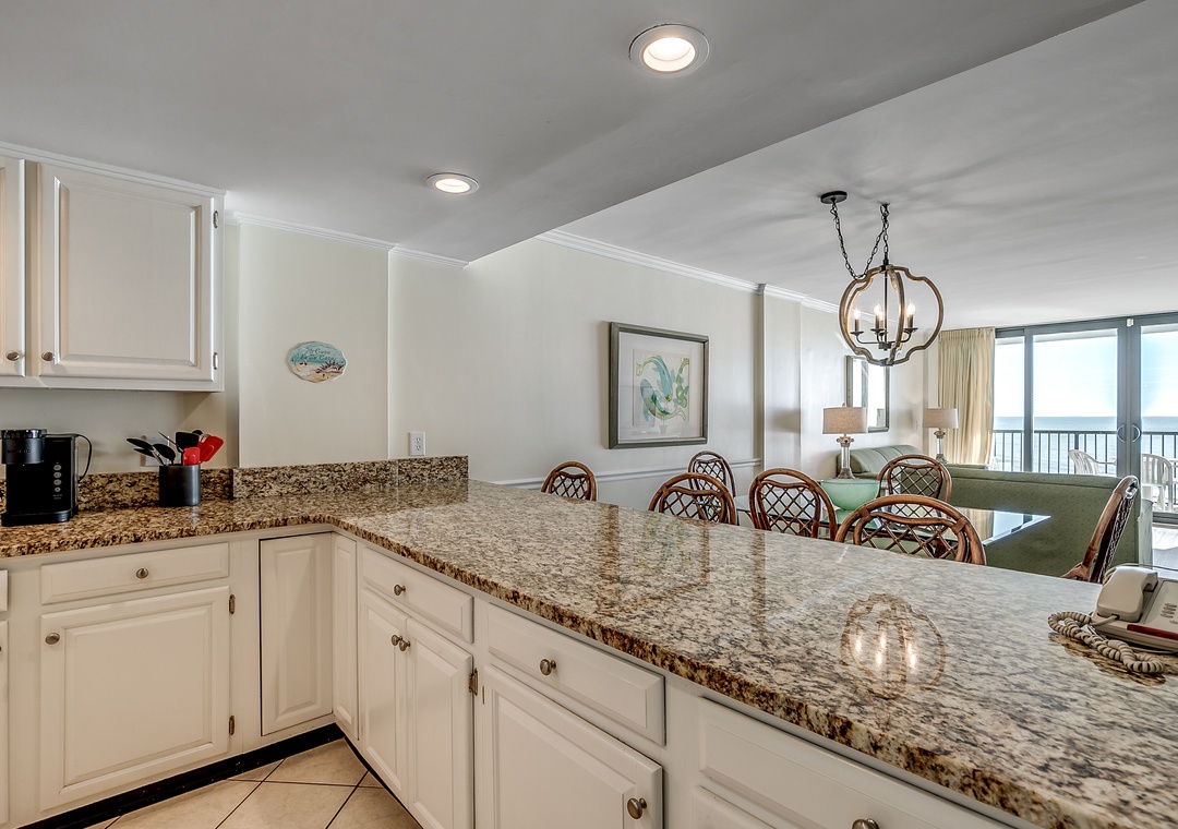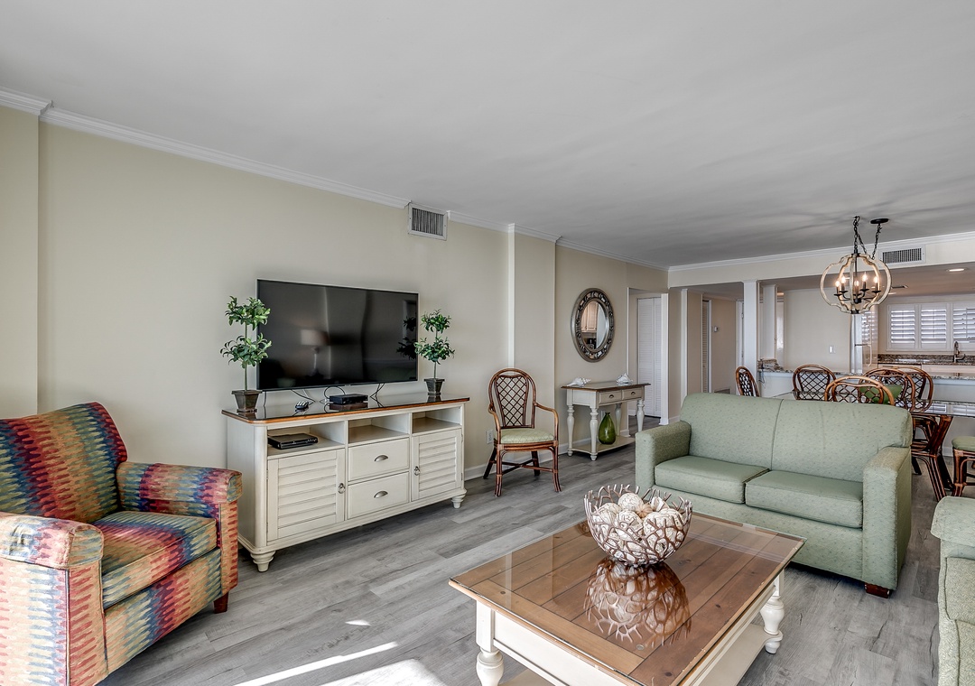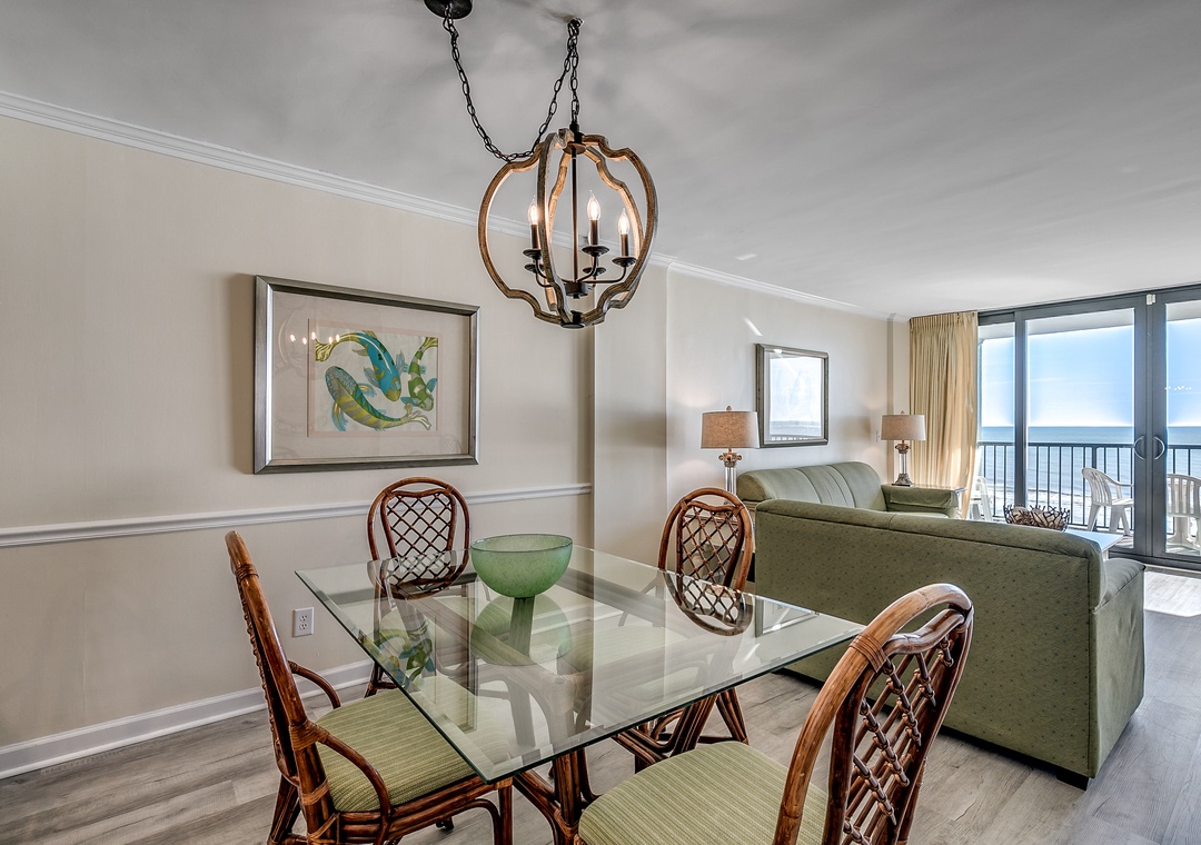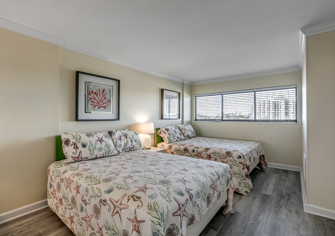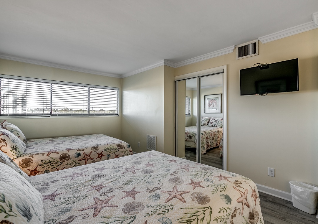 Located in the Carolina Dunes. Beautiful views of the ocean from the oversized balcony of this updated 2 bedroom 2 bathroom condo makes it a perfect stay! You will feel right at home with its large open kitchen, flat screen TVs, full sized washer and dryer, spacious living room and a private balcony giving plenty of room for you and your guests to enjoy your Myrtle Beach vacation. This two bedroom condo has a king bed in the master along with a full bath, the second bedroom offering two queen beds, and the living room providing a sleeper sofa.
