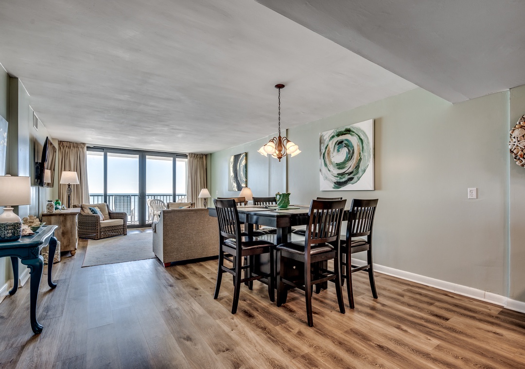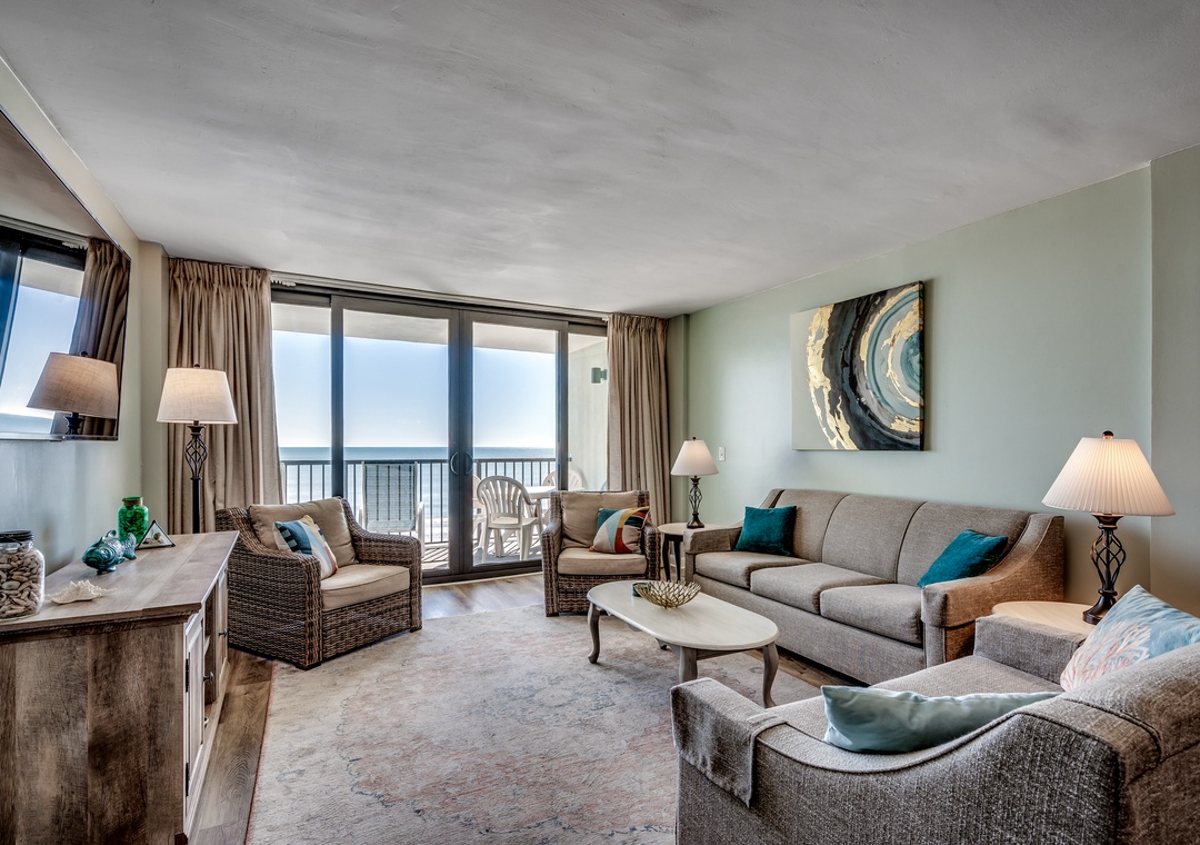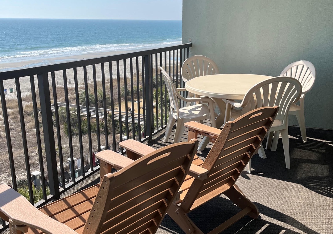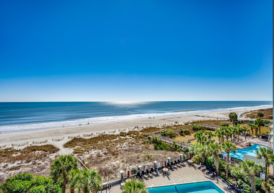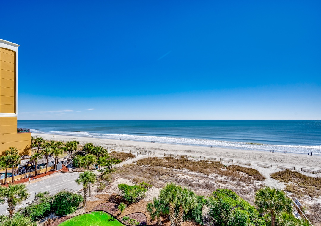 Located in the Carolina Dunes. Enjoy beautiful views of the ocean from the oversized balcony of this 2 bedroom 2 bathroom condo! You will feel right at in its large open kitchen, flat screen TVs, washer and dryer, spacious living room and a private balcony giving plenty of room for you and your guests to enjoy your Myrtle Beach vacation. This two bedroom condo has a king bed in the master along with full bath, second bedroom offers two queens, and the living room provides a sleeper sofa.