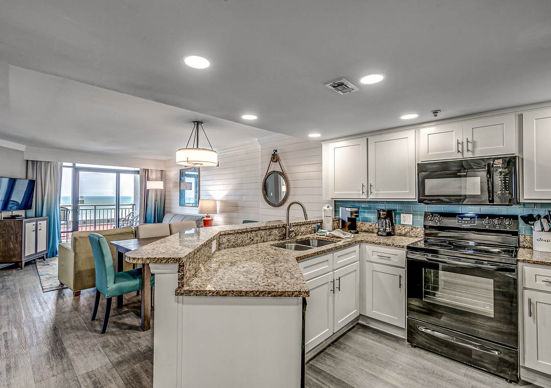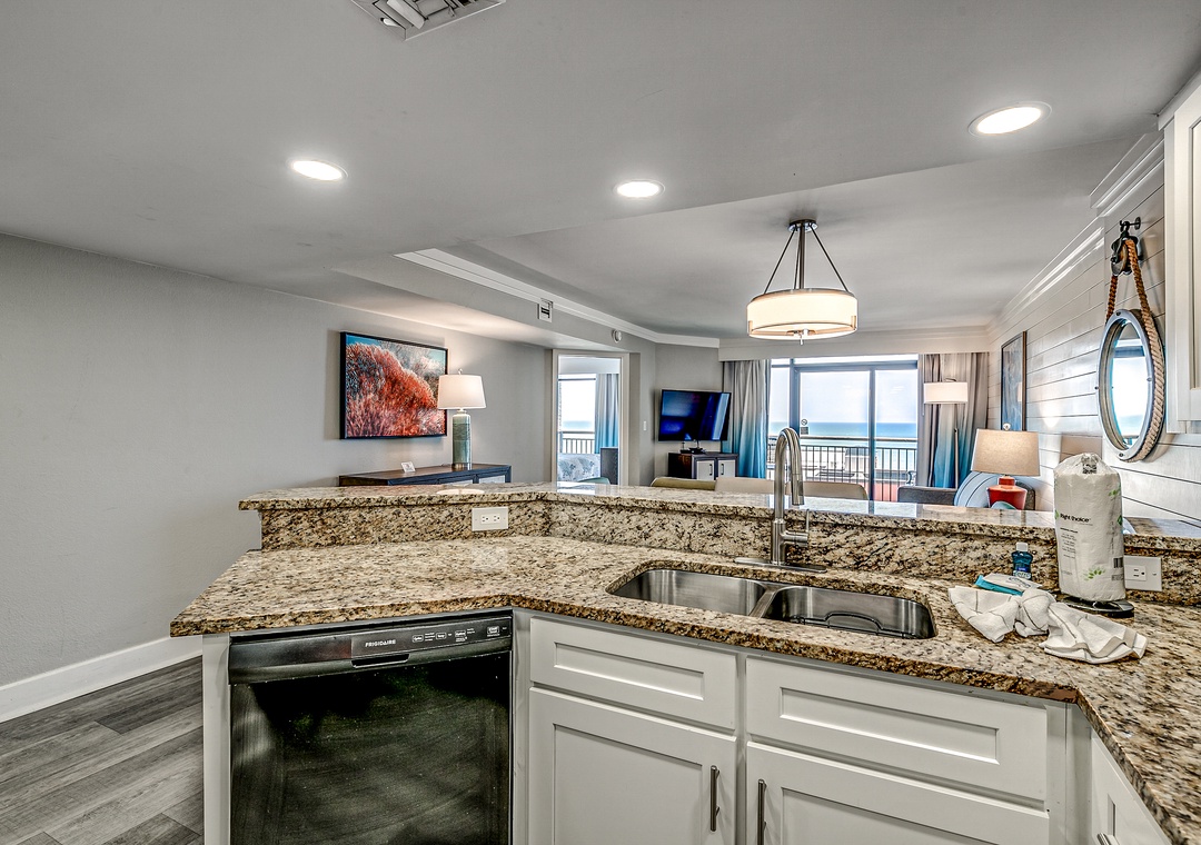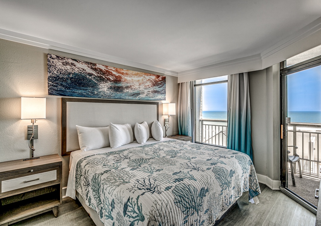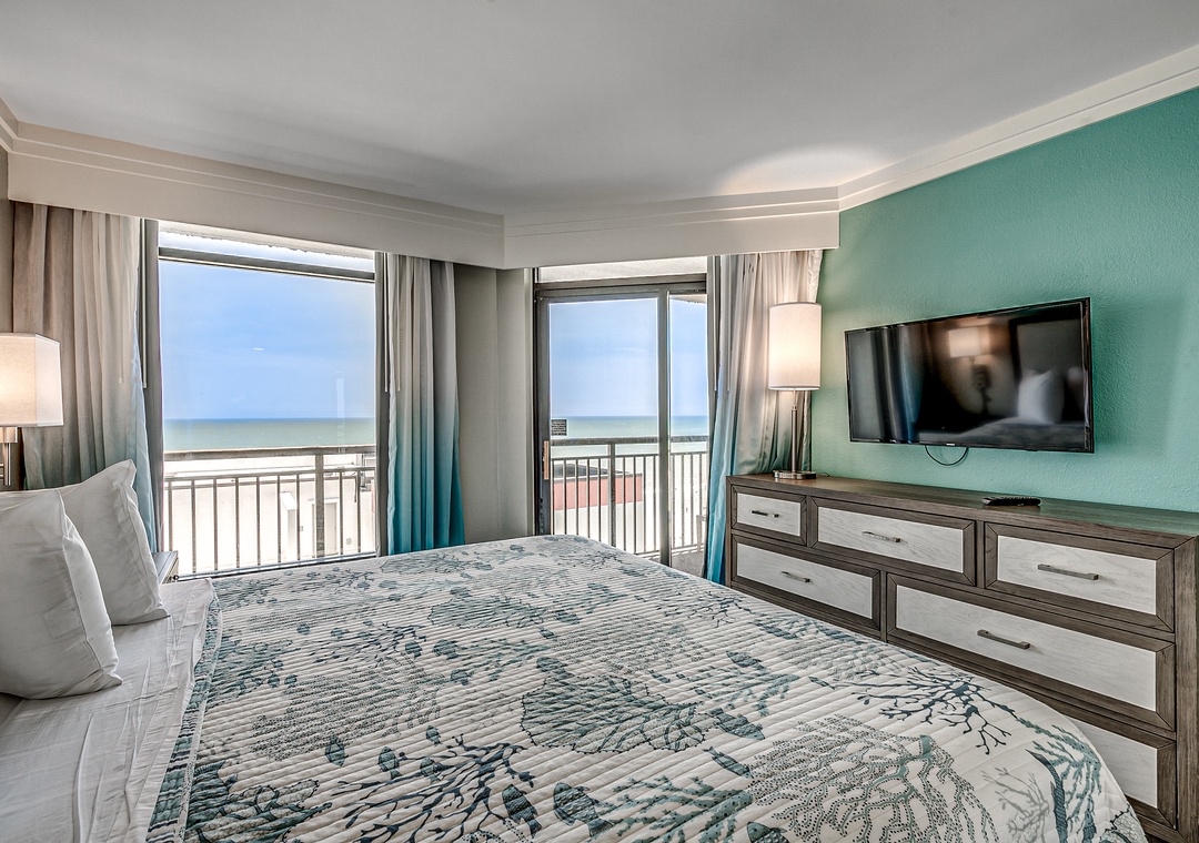 Brought to you by Luxury Beach Rentals, this 3 bedroom suite on the 9th floor offers spectacular views of the blue Atlantic. This condo offers a master bedroom w/ king bed and attached bath w/ large walk-in shower along w/ direct access to the large balcony. The second room offers one queen bed, the third room offers two double beds. Other features include flat screen TVs, washer and dryer, and fully equipped kitchen with granite countertops, this condo creates a large and spacious stay for you and your guests. the resort is located in the heart of the Grand Strand in a quite family oriented section of the beach. Activities on site include the indoor and outdoor pool complex which includes a lazy river, pools, hot tubs, children’s splash pool, three story slide, fitness center and tanning lawn. The resort also has a Starbucks onsite!