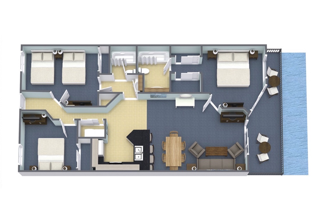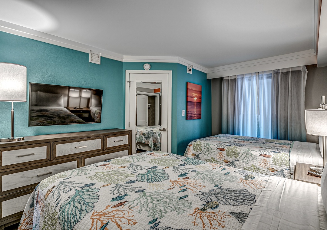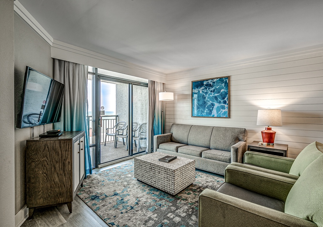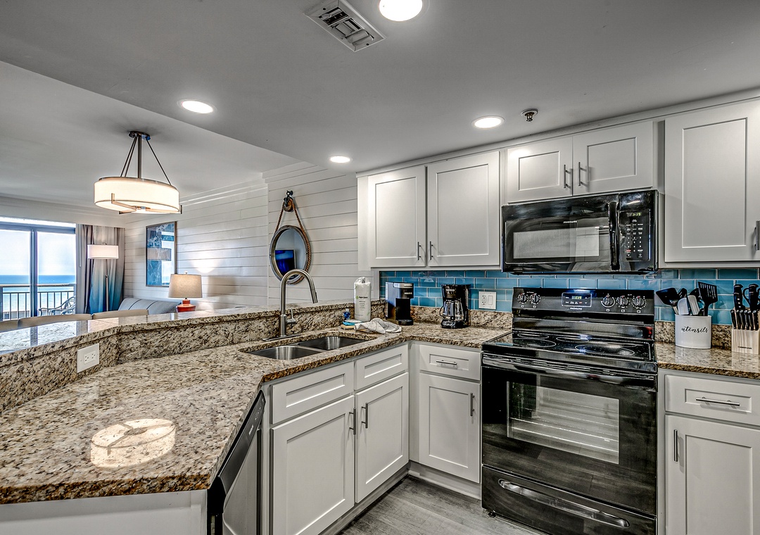 Brought to you by Luxury Beach Rentals, this 3 bedroom suite on the 9th floor offers spectacular views of the blue Atlantic. This condo offers a master bedroom w/ king bed and attached bath w/ large walk-in shower along w/ direct access to the large balcony. The second room offers one queen bed, the third room offers two double beds. Other features include flat screen TVs, washer and dryer, and fully equipped kitchen with granite countertops, this condo creates a large and spacious stay for you and your guests. the resort is located in the heart of the Grand Strand in a quite family oriented section of the beach. Activities on site include the indoor and outdoor pool complex which includes a lazy river, pools, hot tubs, children’s splash pool, three story slide, fitness center and tanning lawn. The resort also has a Starbucks onsite!