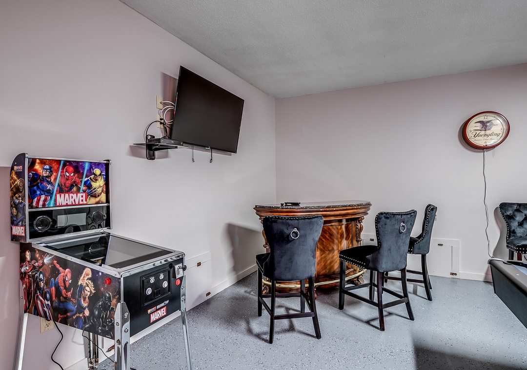- The 4th bedroom is located on the ground level and has two sets of bunk beds (4 doubles beds), a pull out sofa and an en-suite bathroom with a shower. Additionally, there is a lounge/game room with a flat screen TV, a dry bar, arcade style games, pool table and additional full sized refrigerator. Both rooms provide direct access to the the ground-level seating area, putting green and pool/hot tub.