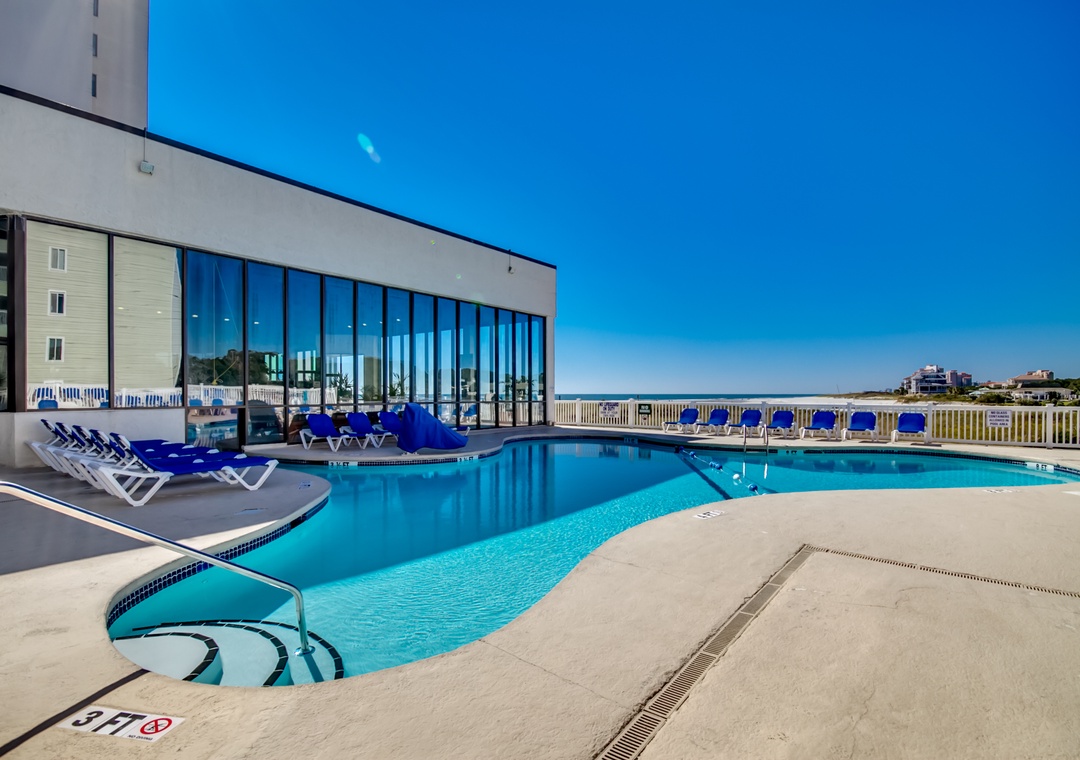 So much free space on the beach, plus the “swamp” river next to the hotel to fish. Parking lot full for places to park close by the building. Restaurant/bar. Indoor pool leading out into the outdoor pool.