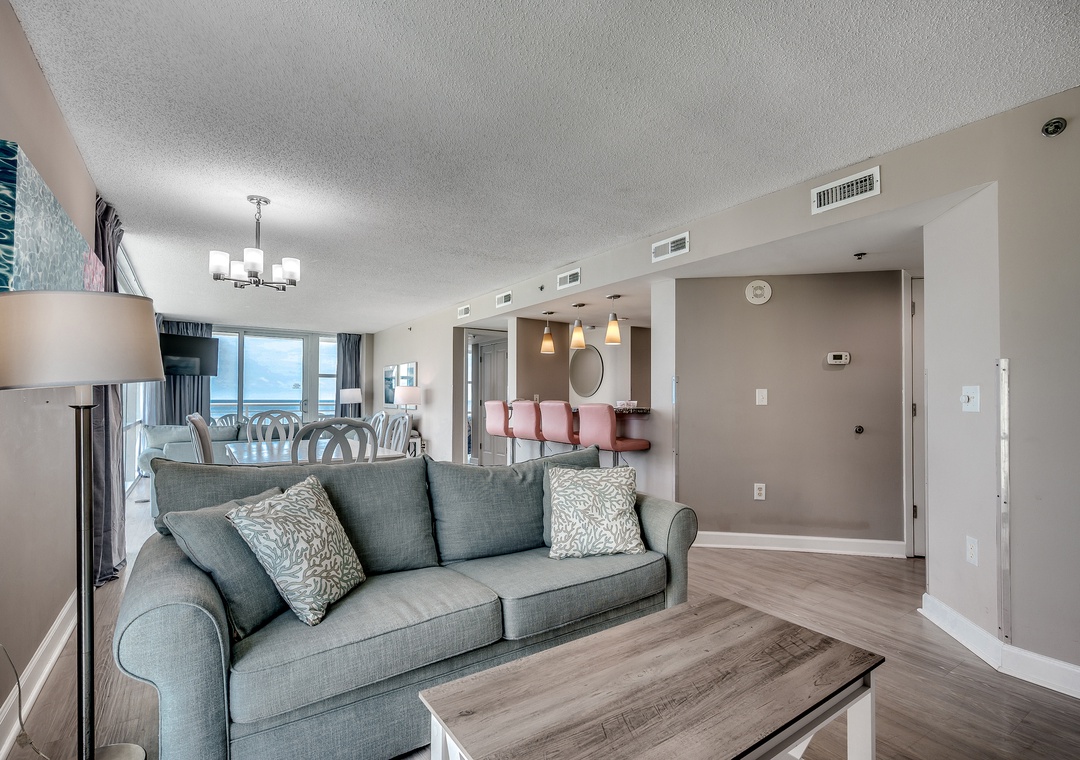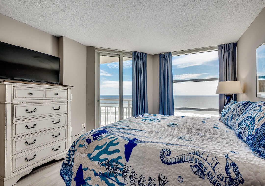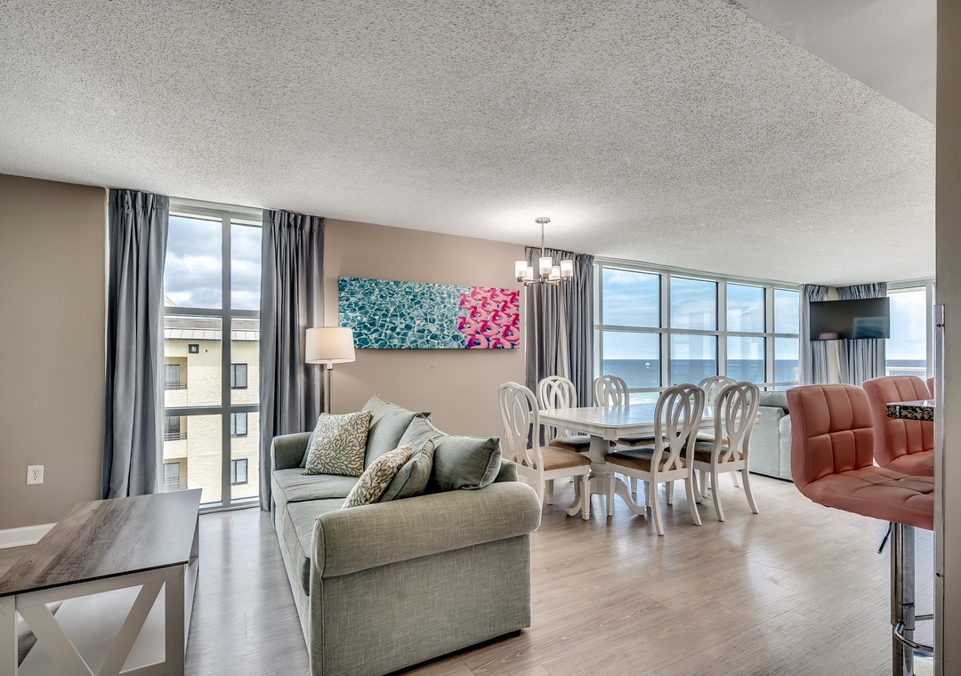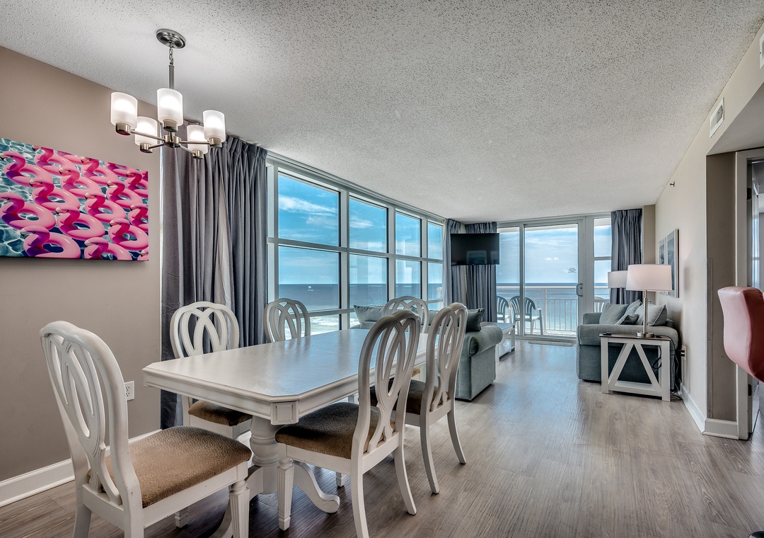 Brought to you by Luxury Beach Rentals! This stunning unit features floor-to-ceiling windows in the living and dining area, giving you panoramic views of the ocean and coastline right from your couch. The master suite offers direct balcony access and stunning ocean views through floor-to-ceiling windows, along with a luxurious master bath featuring an oversized jetted tub. The second bedroom includes a king-sized bed and a unique porthole window that perfectly frames the coastline, while the third bedroom offers two queen-sized beds and an en-suite bath. The spacious living room also provides additional sleeping options with two sleeper sofas, making this unit ideal for families or groups. The open-concept living and dining area flows into a fully equipped kitchen with granite countertops, perfect for cooking up a meal after a day at the beach.