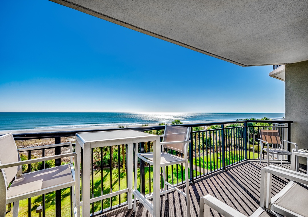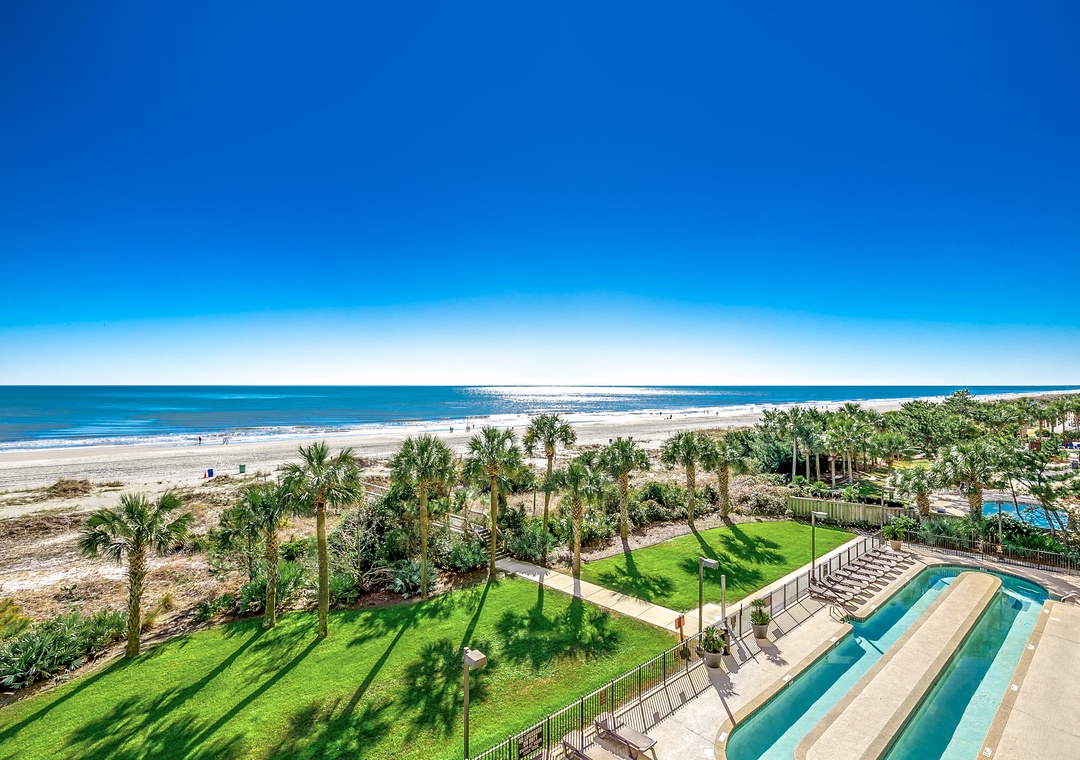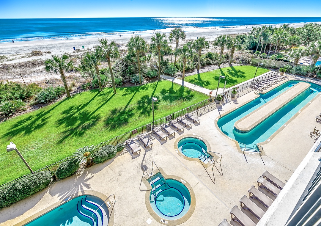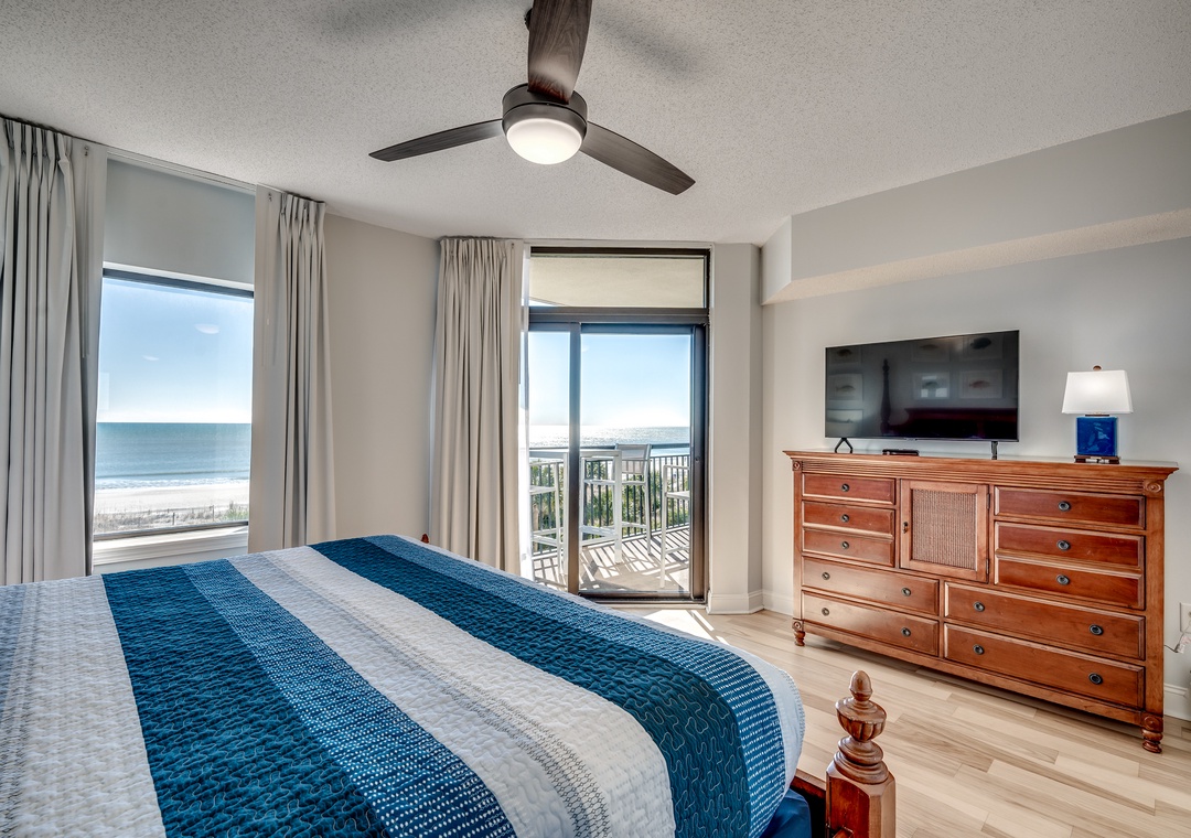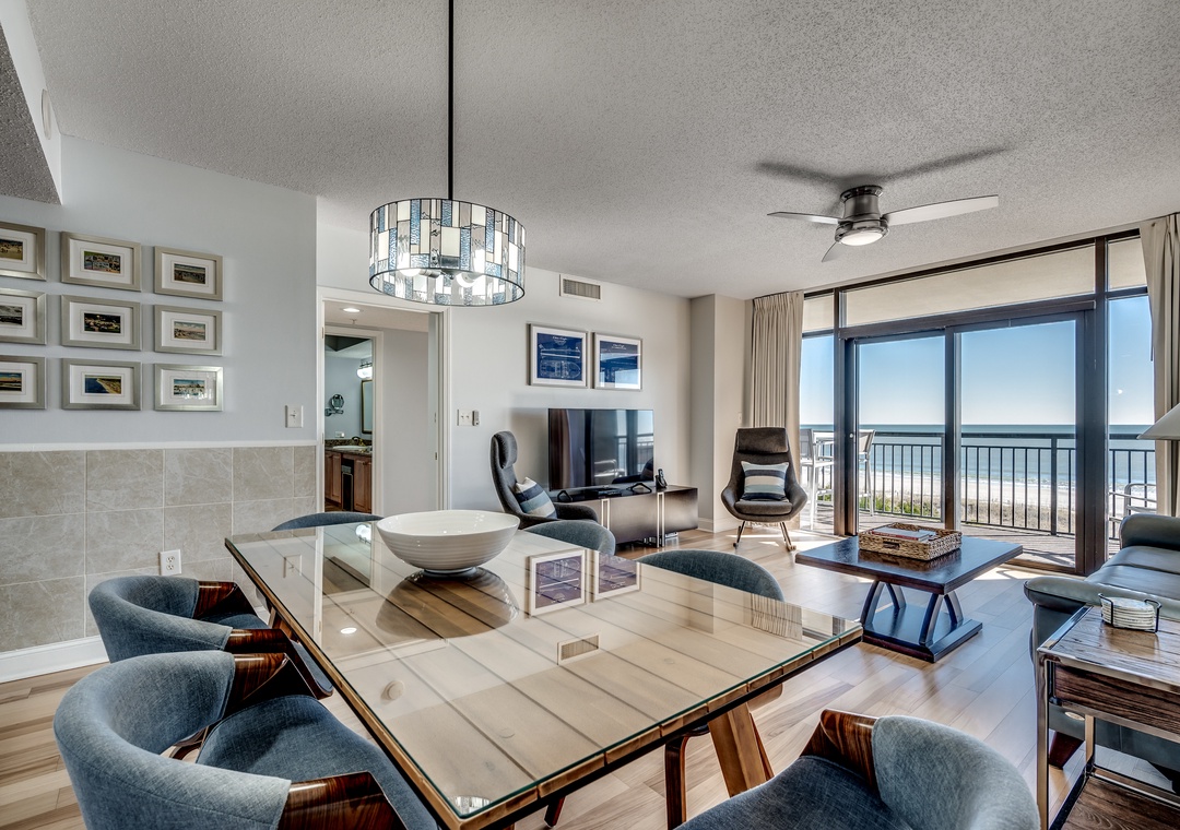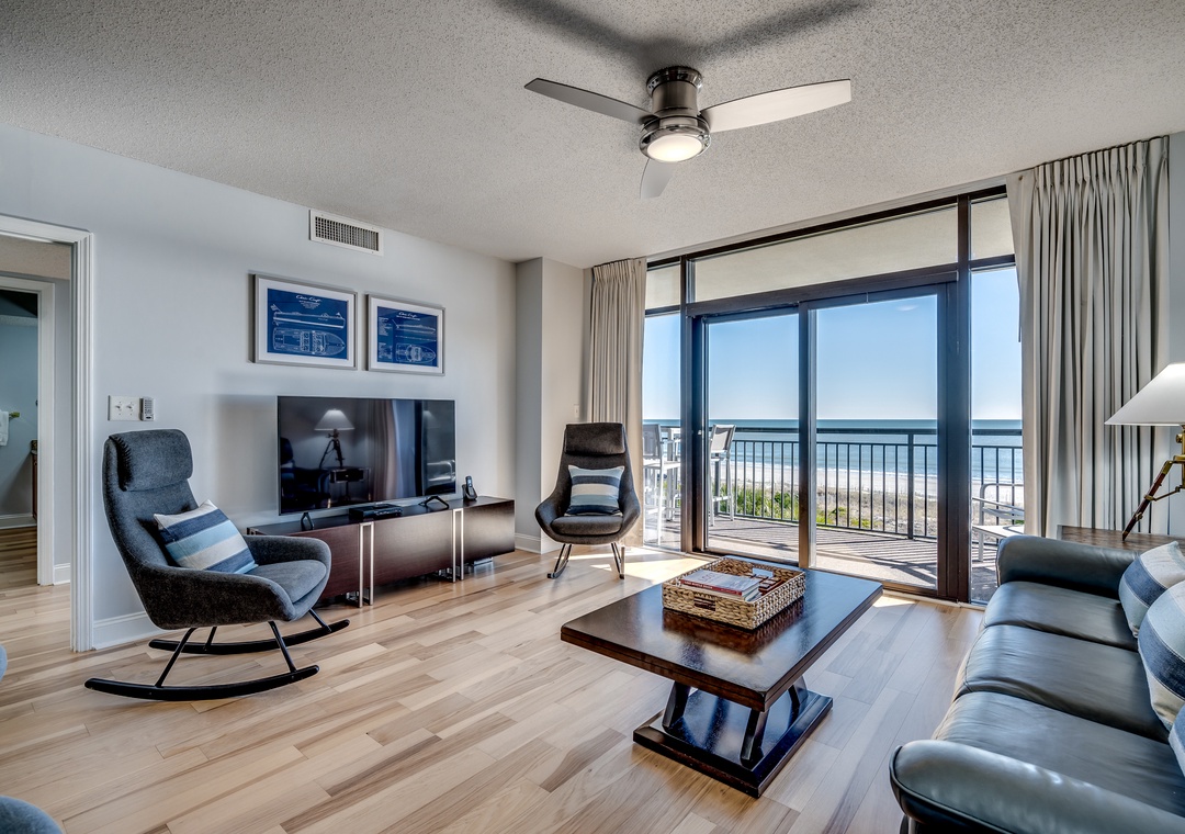 Brand new to the Luxury Beach Rentals program, this oceanfront 2 bedroom suite on the 4th floor offers spectacular views of the blue Atlantic. This condo offers an oceanfront master bedroom with access to the balcony and king bed / attached master bath with granite counter tops and tile flooring. The second bedroom offers two queen beds. Other features include flat screen smart TVs in every room, washer and dryer, and fully equipped kitchen with granite countertops. This condo creates a large and spacious stay for you and your guests. The resort is located in the heart of the Grand Strand in a quiet family oriented section of the beach. Activities on site include indoor and outdoor pools, a lazy river, 4 hot tubs and children’s splash pool all overlooking the beach along with a fitness center and tanning lawn.