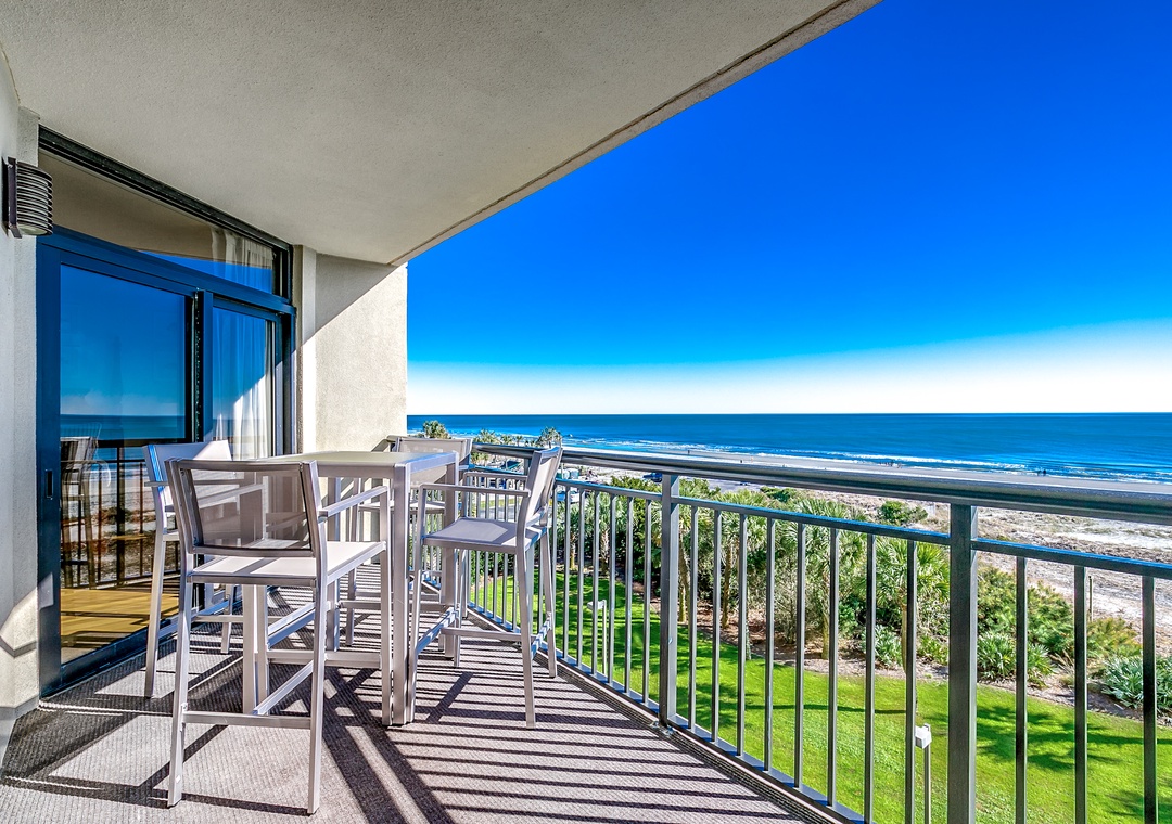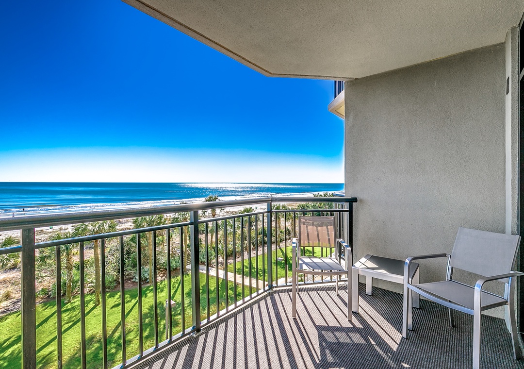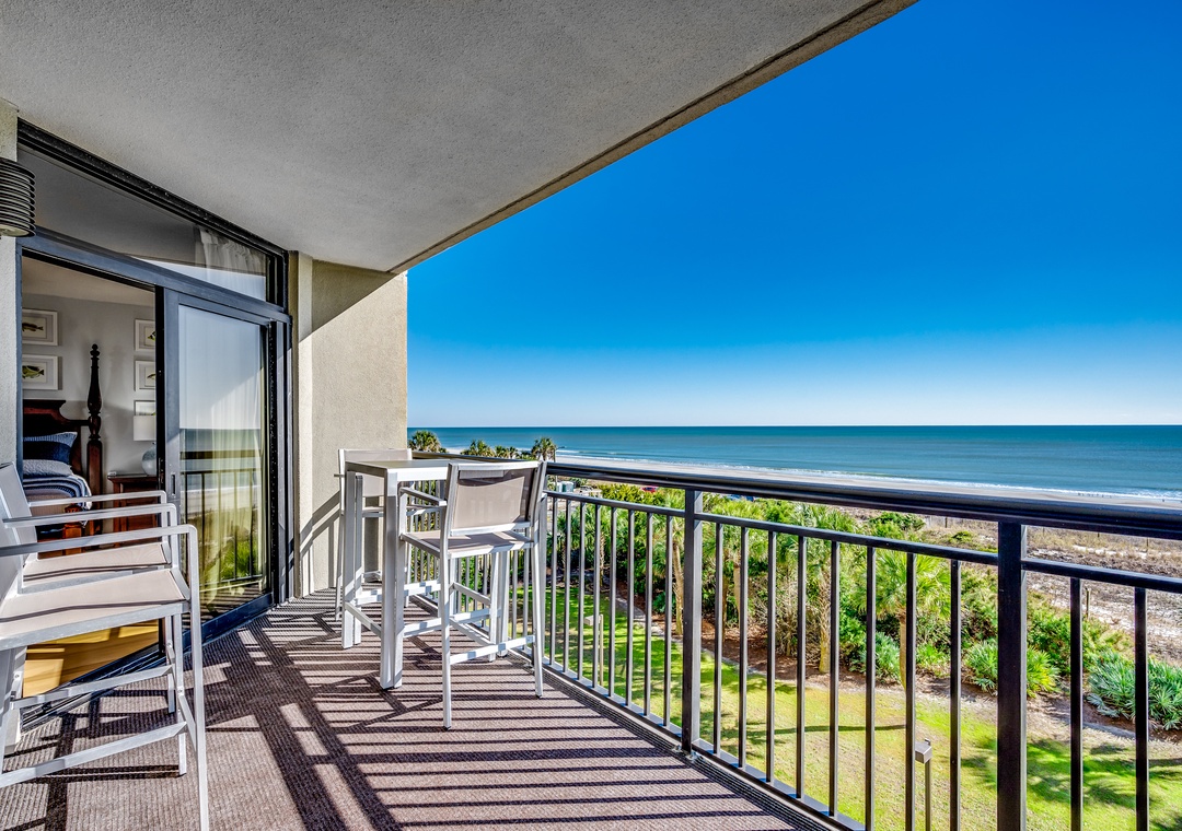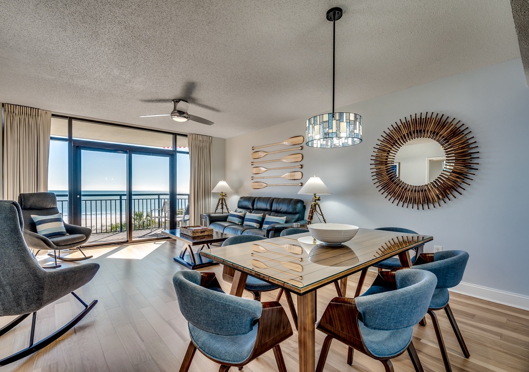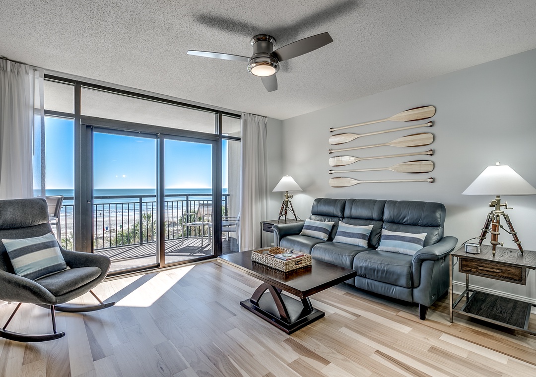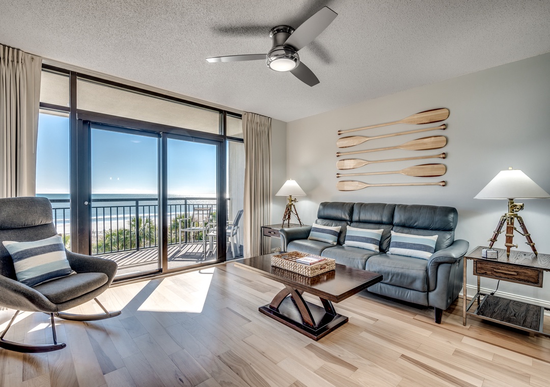 Brand new to the Luxury Beach Rentals program, this oceanfront 2 bedroom suite on the 4th floor offers spectacular views of the blue Atlantic. This condo offers an oceanfront master bedroom with access to the balcony and king bed / attached master bath with granite counter tops and tile flooring. The second bedroom offers two queen beds. Other features include flat screen smart TVs in every room, washer and dryer, and fully equipped kitchen with granite countertops. This condo creates a large and spacious stay for you and your guests. The resort is located in the heart of the Grand Strand in a quiet family oriented section of the beach. Activities on site include indoor and outdoor pools, a lazy river, 4 hot tubs and children’s splash pool all overlooking the beach along with a fitness center and tanning lawn.
