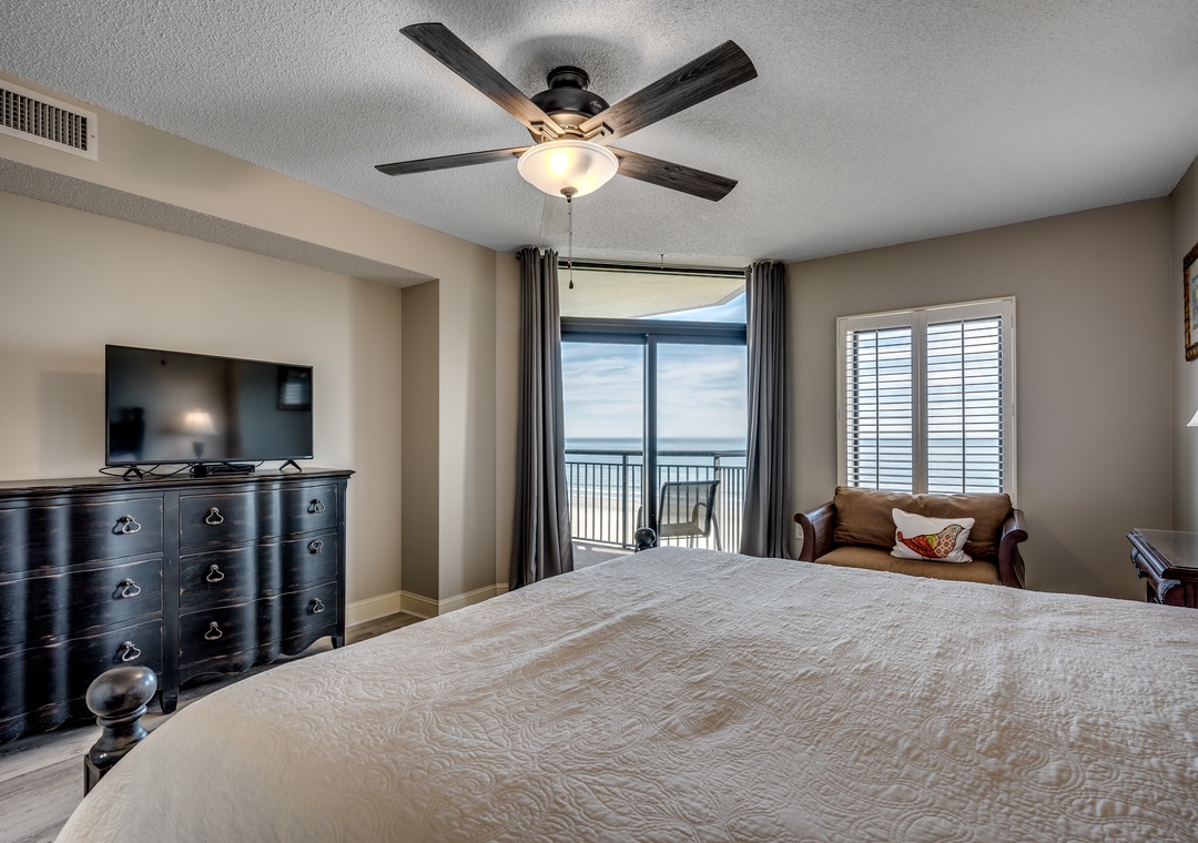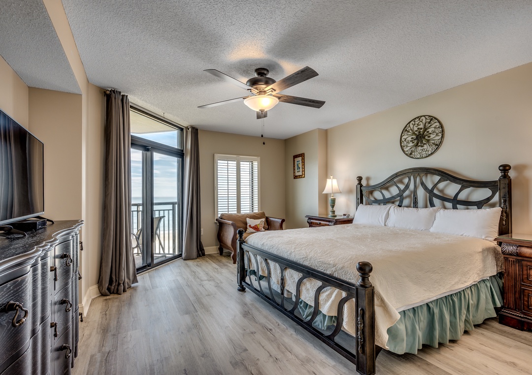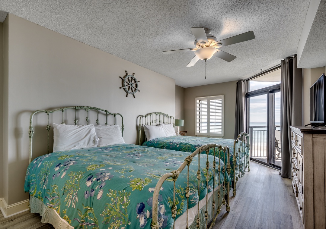 Available by Luxury Beach Rentals, the resort is located in the heart of the Grand Strand in a quiet family oriented section of the beach. This 4 bedroom suite on the 7th floor is oceanfront and offers spectacular views of the blue Atlantic. This condo offers an oceanfront master bedroom with king bed and access to the huge oceanfront balcony. The master bath offers granite counter tops, double vanities, a large Jacuzzi tub, a separate shower and a walk-in closet as well as tile flooring. The second room offers two queens, the third room offers a queen bed, and fourth bedroom with a queen bed. Other features include smartTVs in all rooms, full sized washer and dryer, and fully equipped kitchen with granite countertops, this condo creates a large and spacious stay for you and your guests. Activities on site include the indoor and outdoor pool complex which includes a lazy river, 2 pools, 4 hot tubs and children’s splash pool all overlooking the beach along with a fitness center and tanning lawn.
