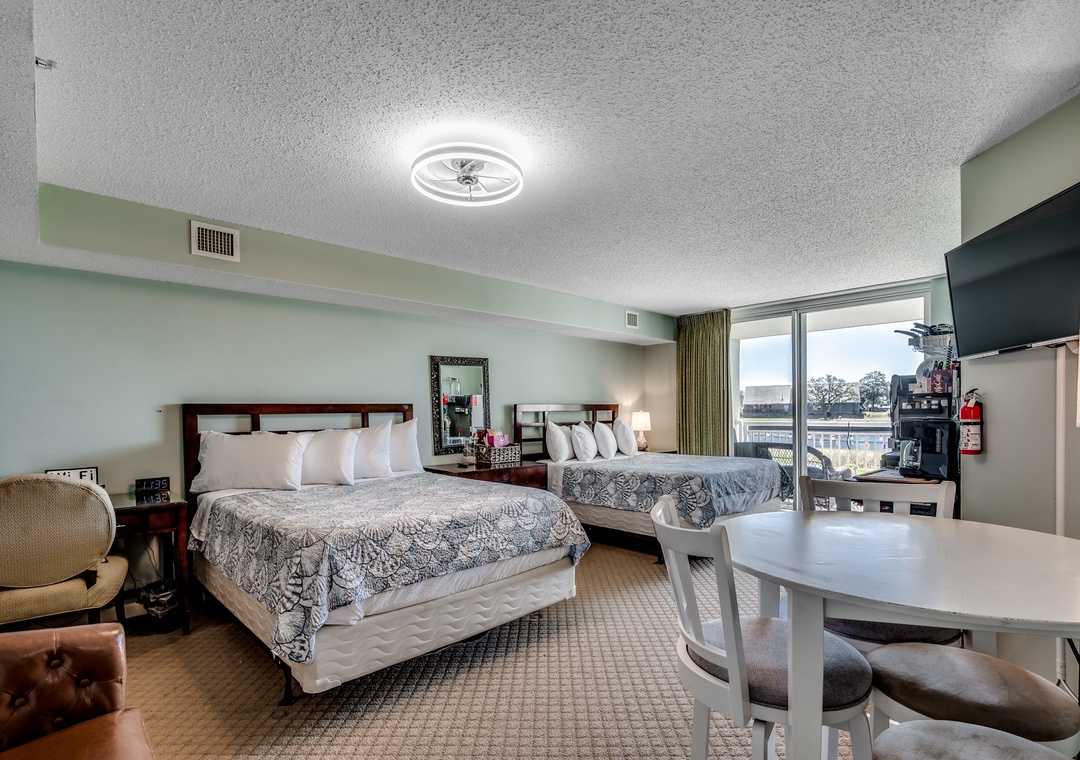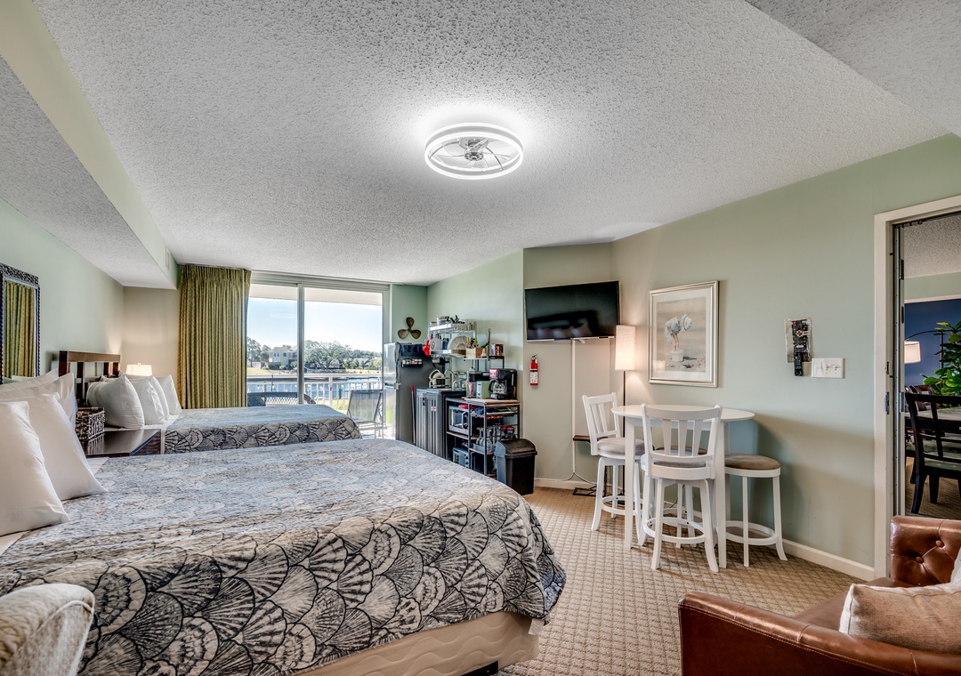 Enjoy a relaxing getaway in this studio condo at Yacht Club Villas in Barefoot Resort, overlooking the Intracoastal Waterway. This unit features two queen beds, an attached bathroom, kitchenette and a private balcony with stunning views.