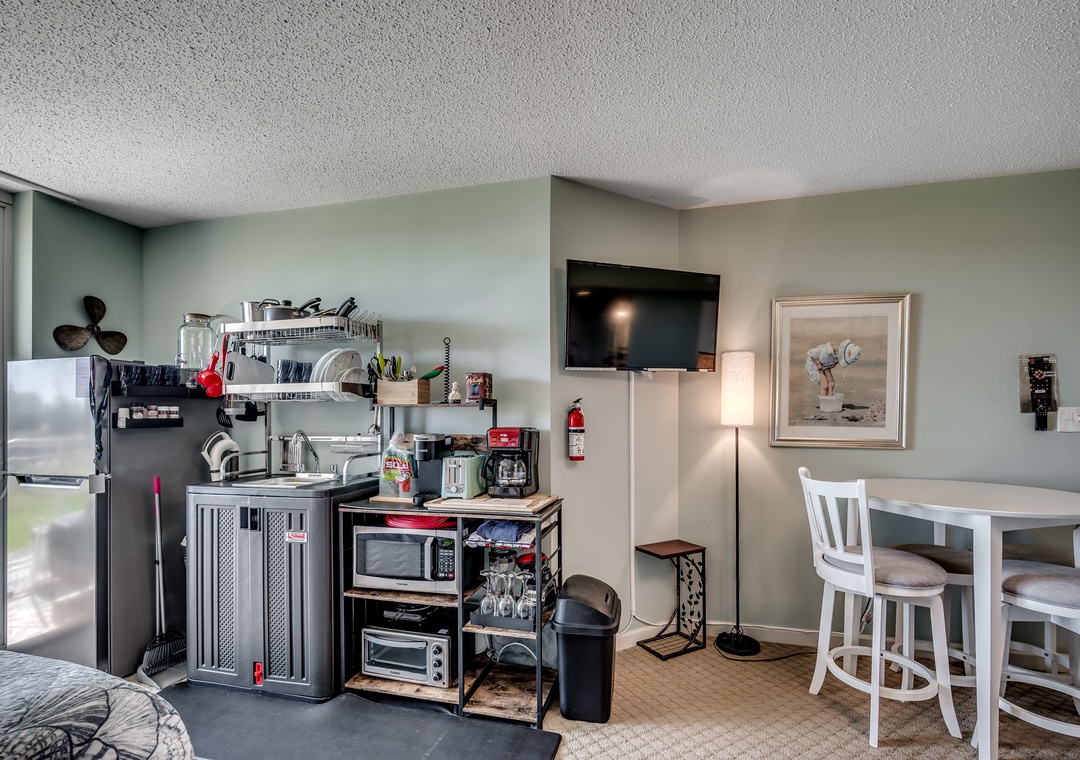 • Kitchenette with cooking basics, refrigerator, coffee maker, toaster oven and microwave.
